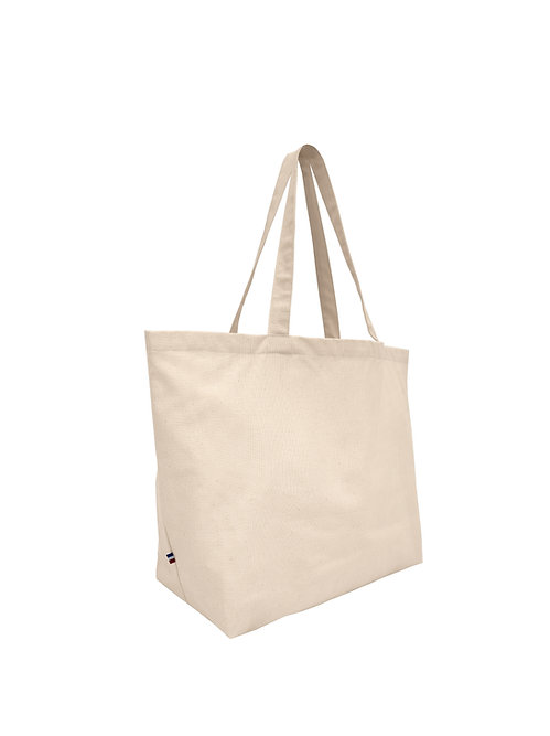 Anses de 3cm, coupées & cousues dans la toile, détail tricolore coté bas.