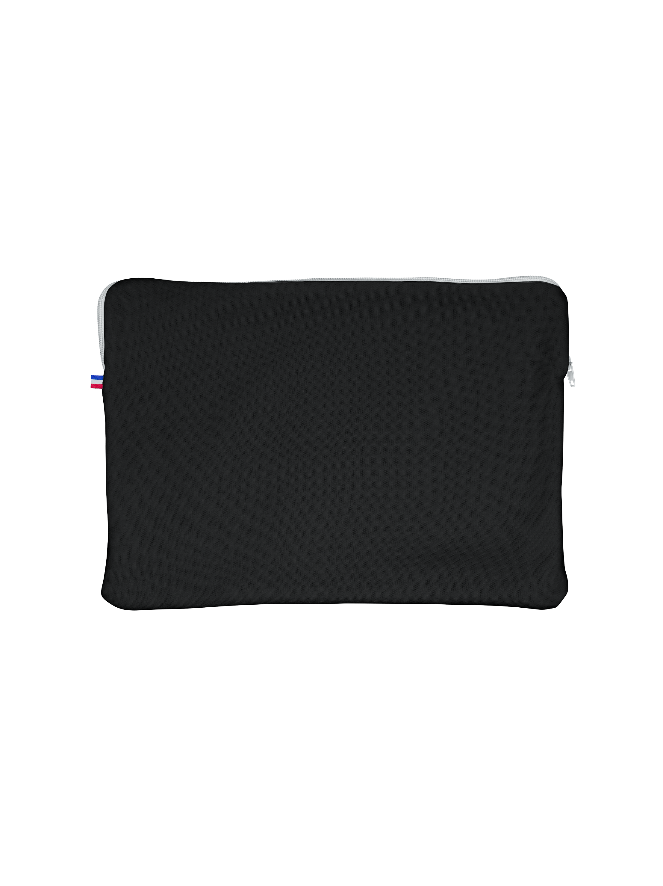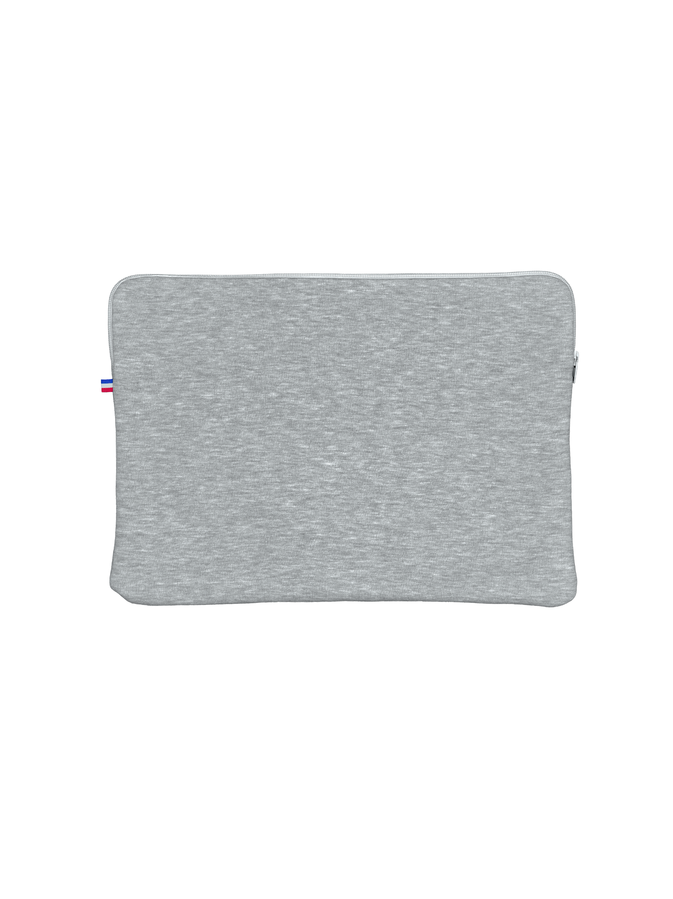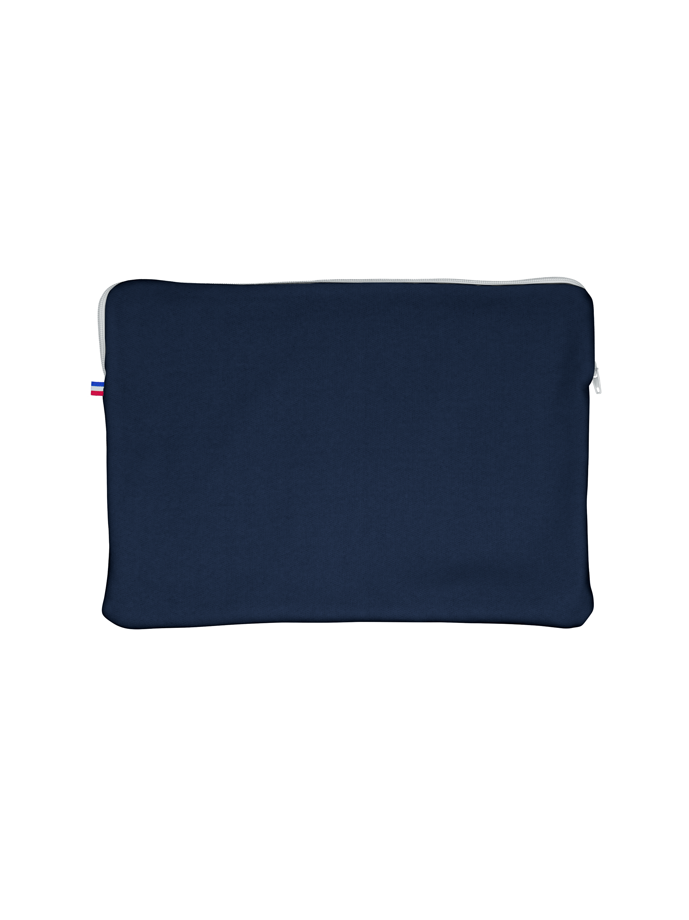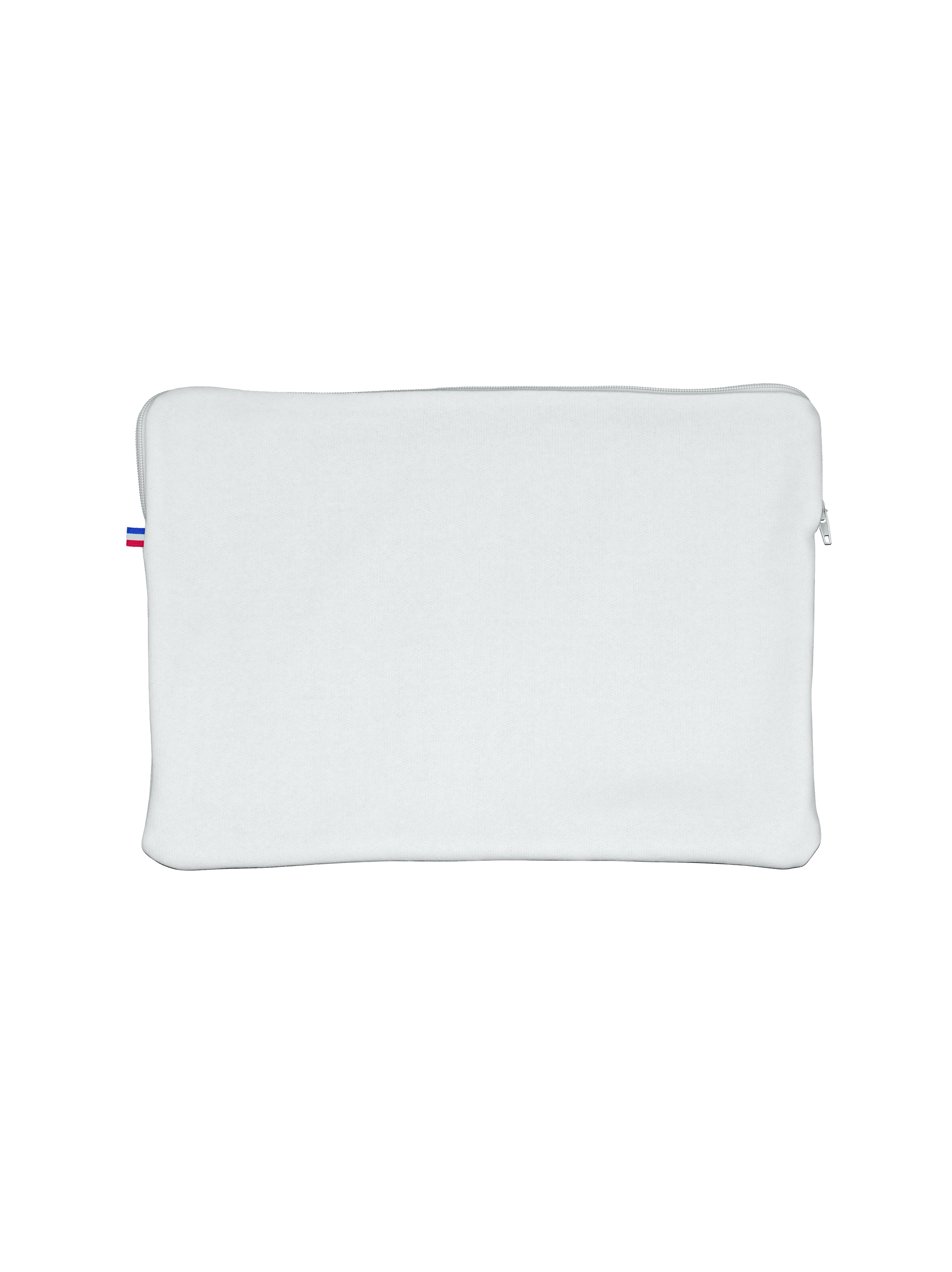 Extérieur en molleton gratté 300gr, 70% Coton Biologique & 30% Polyester, Interieur en toile 240gr, 100% Coton Biologique. Dimension : largeur 39cm x hauteur 28cm x ouverture zip 53cm. Pochette pour ordinateur jusqu’à 14 pouces, zip coloris blanc, détail tricolore sur le coté haut.